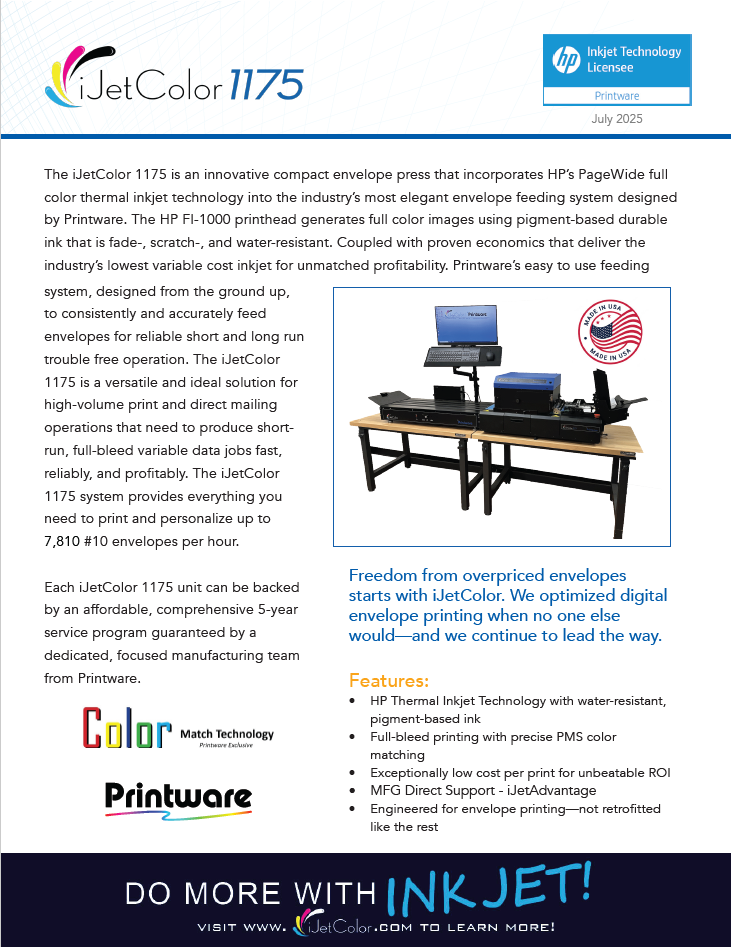 Introducing the iJetColor 1175 an innovative compact designed envelope press that incorporates HP’s PageWide full color thermal inkjet technology into the industry’s most elegant envelope feeding system designed by Printware.