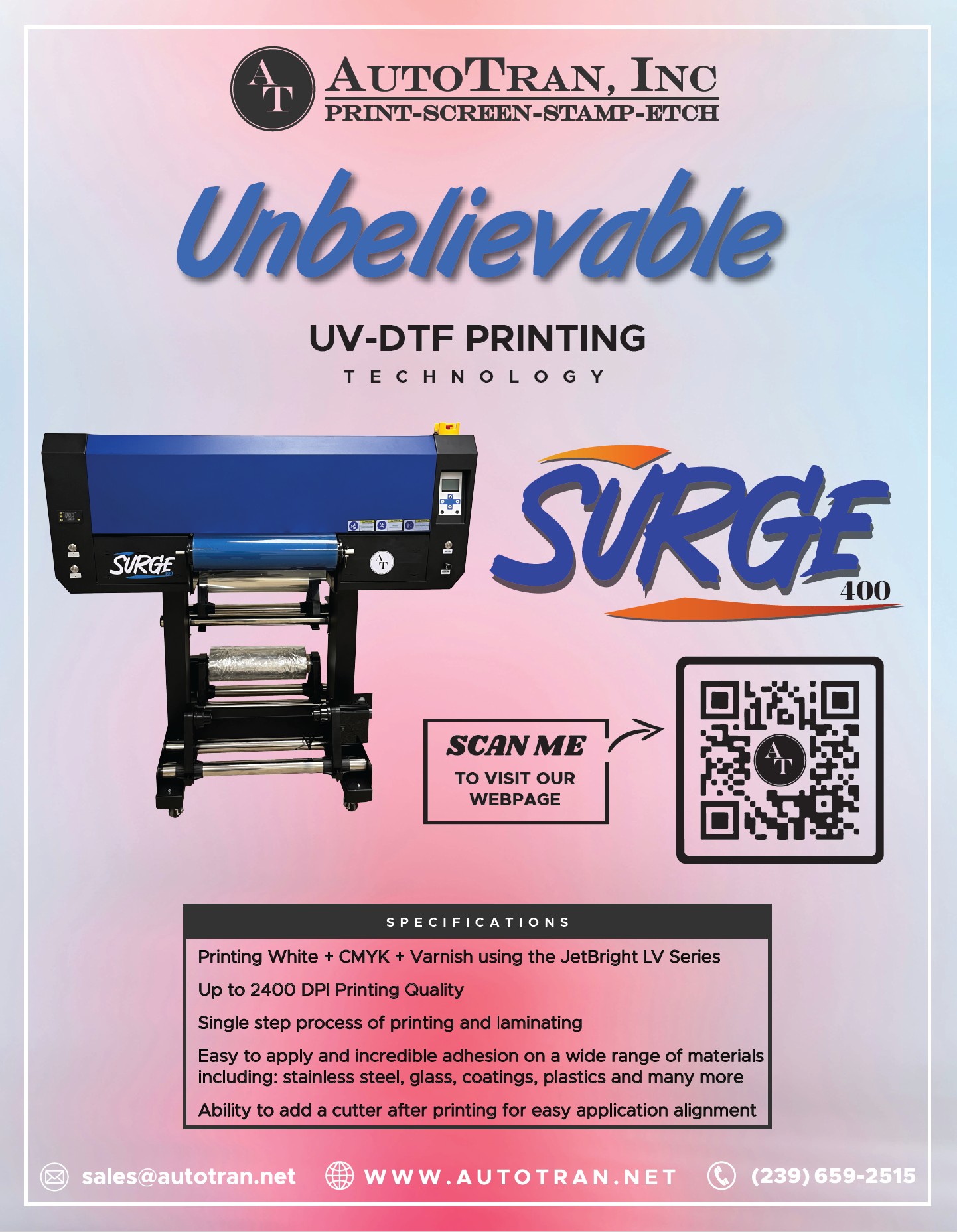 The Surge 400 makes product branding effortless. With its built-in automatic laminator, your UV-DTF transfers are printed and ready to apply instantly—no extra steps required. Perfect for customizing handled drinkware, oversized coolers, and other hard-to-print items, the Surge 400 expands your creative possibilities while keeping costs low.