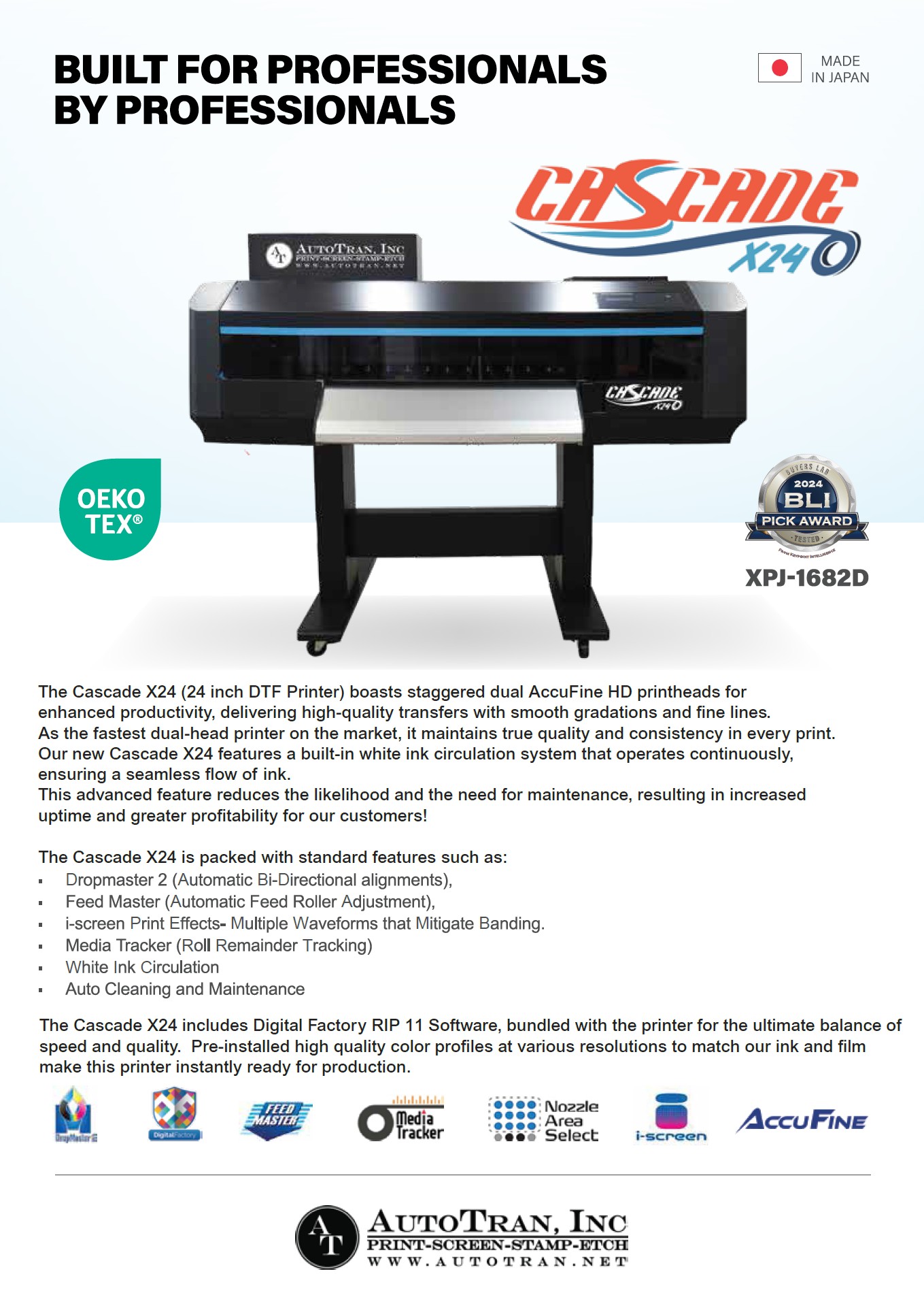 The Cascade X24 (24" DTF Printer) is built for speed, precision, and reliability. Equipped with staggered dual AccuFine HD printheads, it delivers exceptional productivity while producing transfers with smooth gradations, crisp details, and fine lines. As the fastest dual-head printer on the market, the Cascade X24 ensures consistent, high-quality results with every print run. Its continuous white ink circulation system keeps ink flowing seamlessly, reducing clogs and minimizing maintenance. The result: maximum uptime, lower operating costs, and greater profitability for your business.
