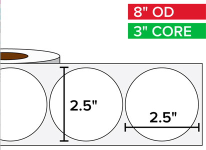 Material: Matte White Paper Label Width: 2.5 inches Label Height: 2.5 inches Core Size: 3 inches Outer Diameter: 8 inches Labels per Row: 1 Inter-Label Gap: 0.25 inches Margins: 0.125 inches Total Width: 2.75 inches Labels per Roll (approx.): 2,040