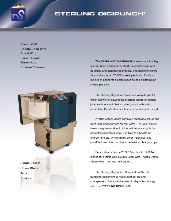 The Sterling® Digipunch® is an economical, high-speed automatic paper punching machine designed specifically for short-run binderies, digital printers, and commercial shops. Despite its compact footprint, it is a powerhouse of productivity, capable of punching up to 72,000 sheets per hour—equating to roughly half a million sheets per shift. The system is engineered for versatility, allowing operators to punch sheets with covers or tabs intermixed while supporting a wide range of hole patterns, including Plastic Coil, Double Loop Wire, Plastic Comb, and Three-Hole.