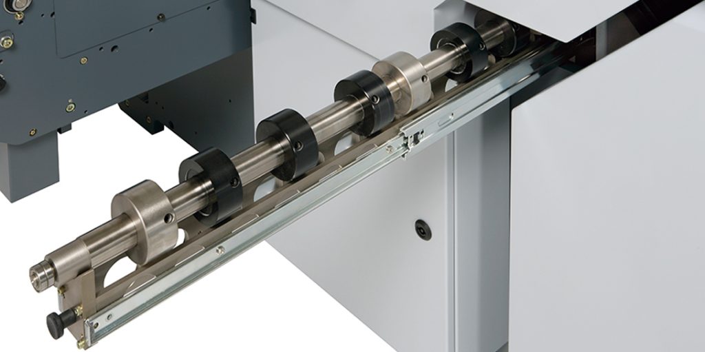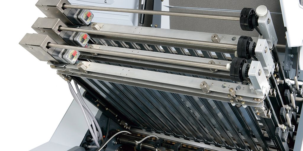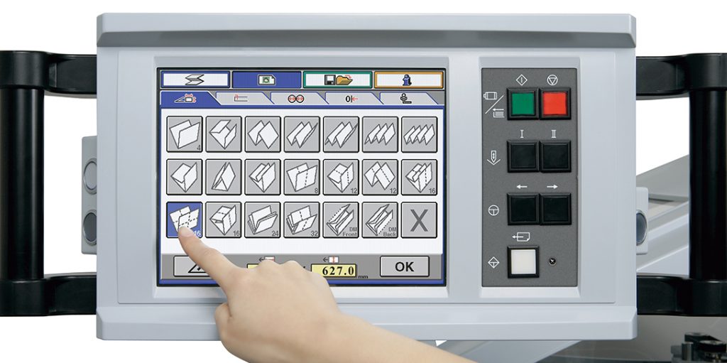 The Standard Horizon AFC-746F B1 Pallet-Feed Folder includes advanced set-up automation through a user-friendly color touch-screen control panel that displays all common fold formats and sheet sizes for easy selection.