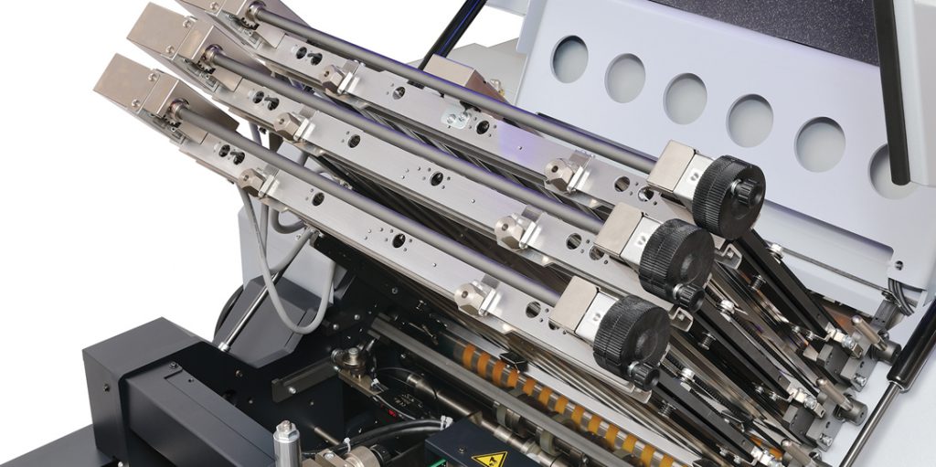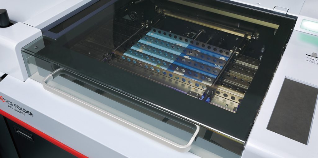 The automated AFV-566FKT Folder is a 6-buckle folder with integrated knife/buckle cross-folding that contains 44 fully-automated settings for improved efficiency, more operator-friendly production, and reduced waste and make-ready.
