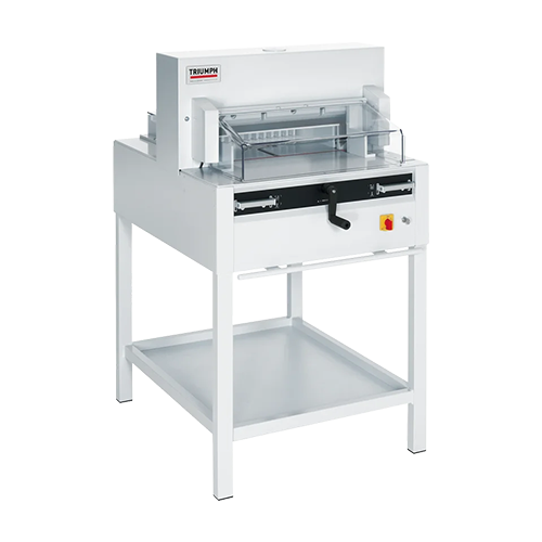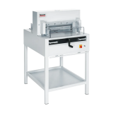 Ergonomic, 37 inch working height. Electric blade and clamp drive. Spindle-guided back gauge with calibratedcrank. Front table digital display (cm or inches) for precise back gauge positioning. Bright, LED optical cuttingline. Adjustable back gauge with narrow separations and plastic gliders. Automatic clamp. Dual side guides onfront and rear tables. High quality, German steel blade. Solid steel blade carrier and adjustable blade guides.All-metal construction. Includes stand with storage shelf, easy-access tool holder, and paper blocking tool.Optional side tables increase work surface.