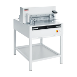 Ergonomic, 37 inch working height. Electric blade and clamp drive. Electric back gauge drive with touchpad for easy programming. Digital measurement display (cm or inches) with multilingual operator guidance, accurate to 1/10 mm or 1/100 inch. Stores 99 programs with up to 99 steps in each (up to 15 repeat cuts can be integrated as a single step). Pre-programmed for standard paper sizes. Memory key for repeat cuts. Automatic SET function for reference measurement and EJECT function for pushing out paper. Self-diagnostic system with error indication on display. Electronic hand wheel with variable speed control for manual back gauge setting. Bright, LED optical cutting line. Adjustable, spindle guided back gauge with narrow separations and plastic gliders.