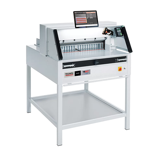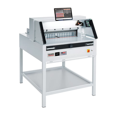 Comprehensive SCS safety package: patented EASY CUT electronic blade activation bars for true two-hand operation; IR light beam safety curtain on front table; safety cover on rear table; main switch and safety lock with key; 24 volt controls (low voltage); patented IDEAL safety drive; automatic blade and clamp return from every position; disc brake for instant blade stop; blade changing device covers cutting edge of blade; blade depth adjustment from outside of machine; blade and cutting stick can be changed without removing covers. Ergonomic, 37 inch working height. Electric blade and clamp drive. Electric back gauge drive with touchpad for easy programming. Digital measurement display (cm or inches) with multilingual operator guidance, accurate to 1/10 mm or 1/100 inch. Stores 99 programs with up to 99 steps in each (up to 15 repeat cuts can be integrated as a single step). Pre-programmed for standard paper sizes. Memory key for repeat cuts. Automatic SET function for reference measurement and EJECT function for pushing out paper. Self-diagnostic system with error indication on display. Electronic hand wheel with variable speed control for manual back gauge setting. Bright, LED optical cutting line. 3-step, LED front table illumination; Adjustable, spindle guided back gauge with narrow separations and plastic gliders. Dual side guides on front and rear tables. High quality, German steel blade. Solid steel blade carrier and adjustable blade guides. All-metal construction. Includes stand with storage shelf, easy-access tool holder, and paper blocking tool. Optional side tables increase work surface.