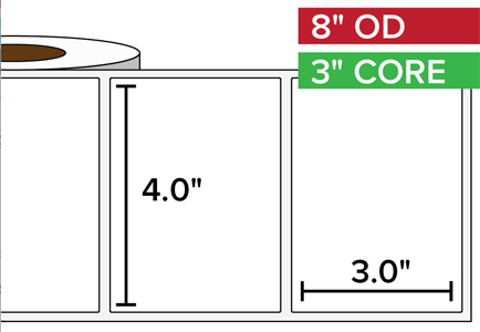 Material: Matte White Polypropylene (BOPP) Label Width: 4 inches Label Height: 3 inches Core Size: 3 inches Outer Diameter: 8 inches Labels per Row: 1 Corner Radius: 0.125 inches Inter-Label Gap: 0.25 inches Margins: 0.0625 inches Total Width: 4.125 inches Labels per Roll (approx.): 1730